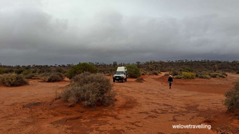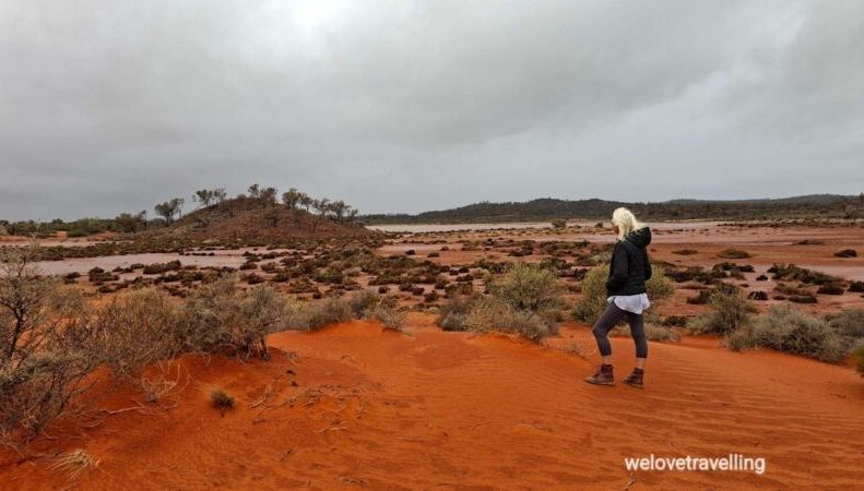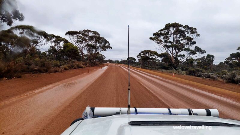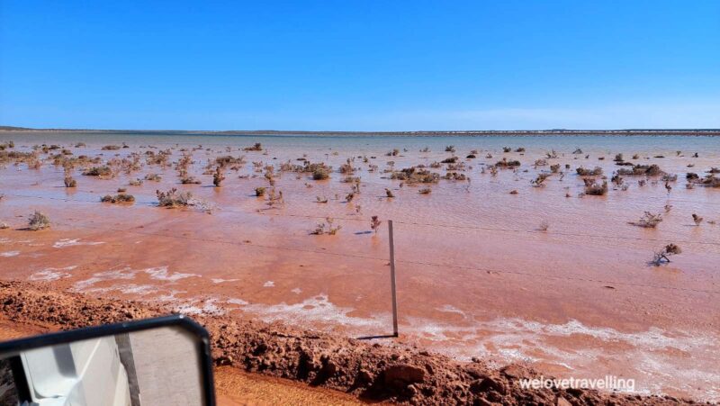Am nächsten Morgen geht es wieder früh los, zunächst Richtung Sandstone auf noch geteerter Piste, die irgendwann jedoch in Gravelroad übergeht. Der Untergrund wird immer weicher und laut Karte führt die Strecke durch Trockenseen, die ja bekanntlich momentan alles andere als trocken sind. Da beschließen wir umzukehren und über Menzies und Leonora auf der geteerten Straße weiter Richtung Geraldton zu fahren. Besser so🤗.