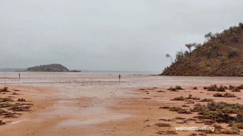 Über Menzies geht es nach Osten zum Skulpturen Park Lake Ballard. Wir wurden gewarnt, dass es hier so heiß ist, dass das Brot in einer halben Stunde in der Plastiktüte austrocknet und dass man sich immer wieder runterkühlen muss, hier in der Wüste.