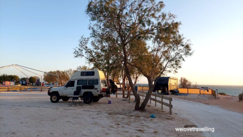 Schnell sind wir uns einig, dass es keinen Sinn macht nur im Auto zu sitzen. Wir fahren nach Denham auf den Tasman Caravan Park und sind sehr froh über diese Entscheidung.
