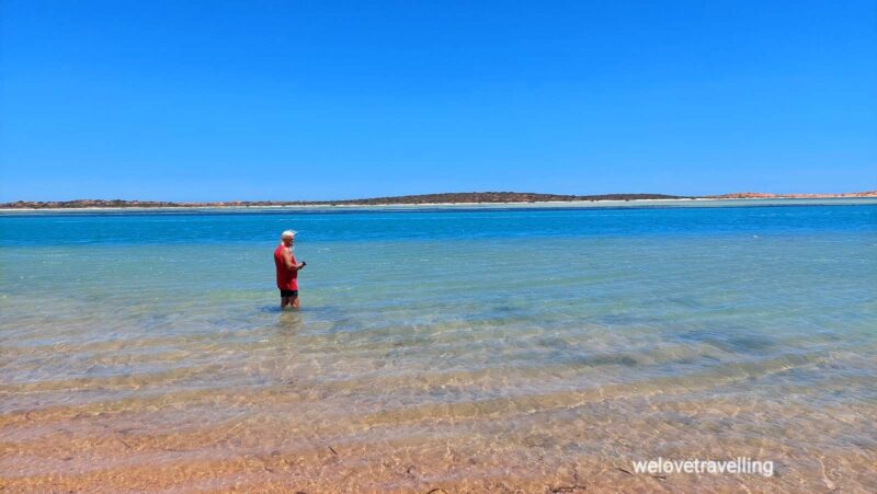 Am nächsten Tag jedoch dreht der Wind und kommt aus dem Landesinneren, direkt aus der Wüste, wie ein heißer Fön und bringt Myriaden von Fliegen mit, die in die Augen, Nase, Ohren und Mund kriechen und alle Stellen des Körpers bedecken. Im Auto sind ebenfalls alle Flächen von Fliegen besetzt. Wir verbringen viel Zeit im Wasser, wo ich auch mein Müsli esse. Die Situation hat sich nicht gebessert bis heute. Wir fahren gemeinsam mit Christian und Sabrina nach Coral Bay. Die Beiden wollen sich erholen von den Fliegen und essen gehen. Wir bleiben in Coral Bay auf dem Peoples Park Campingplatz und kümmern uns um eine Buchung für eine Schnorcheltour mit Mantarochen.