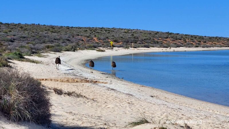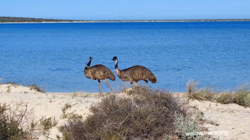 Auf der Peron Halbinsel gibt es Einiges anzuschauen. An der farbenprächtigen Little Lagoon begegnen uns Emus am Morgen.