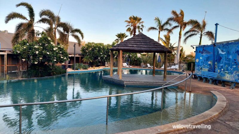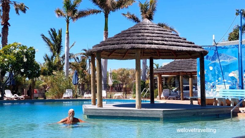 Bei großer Hitze mit Sprühfläschchen im Auto zum abkühlen und vielen kalten Getränken erreichen wir Carnarvon und hüpfen als erstes in den Pool des Coral Coast Holiday Parks. Die nächste Abkühlung gibt es dann im Woolworth beim Einkauf.