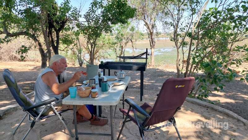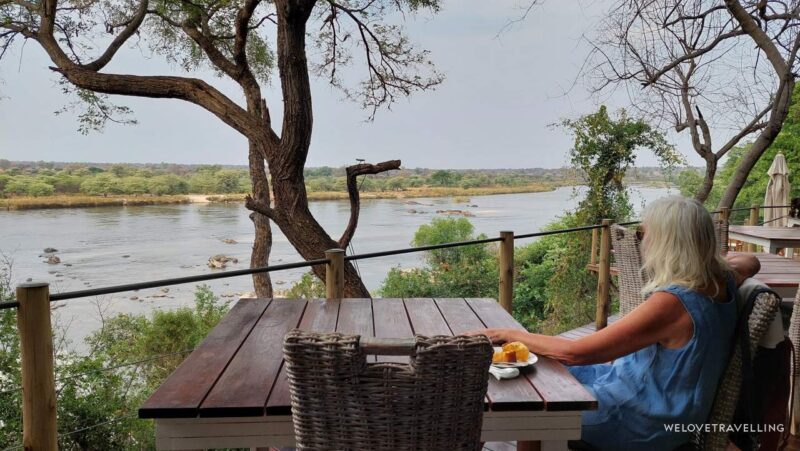 Frühstück mit Blick auf badende Hippos und grasende Antilopen.