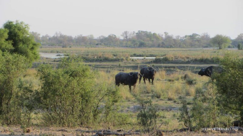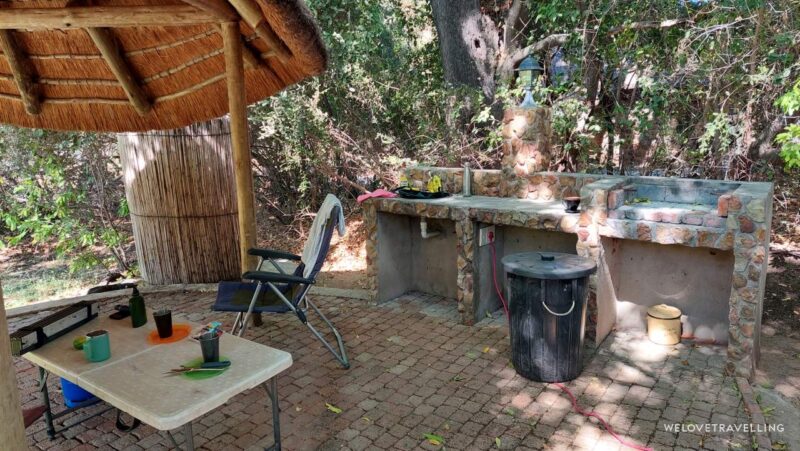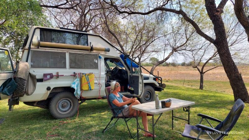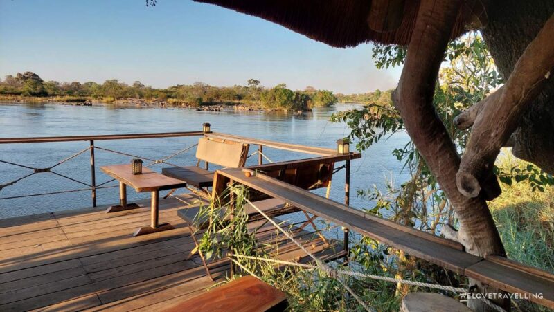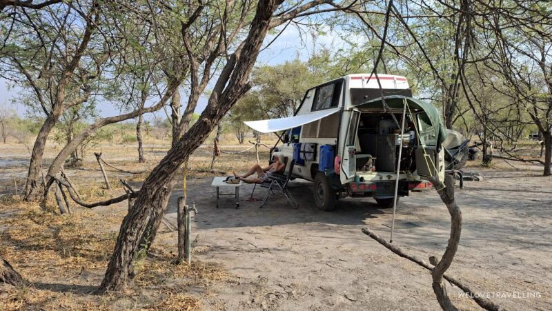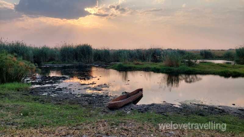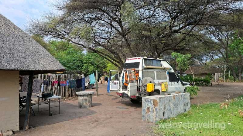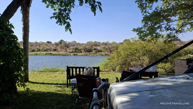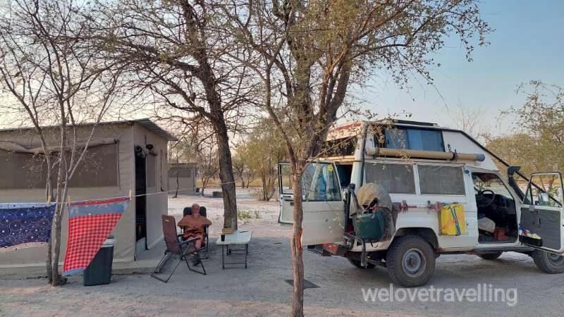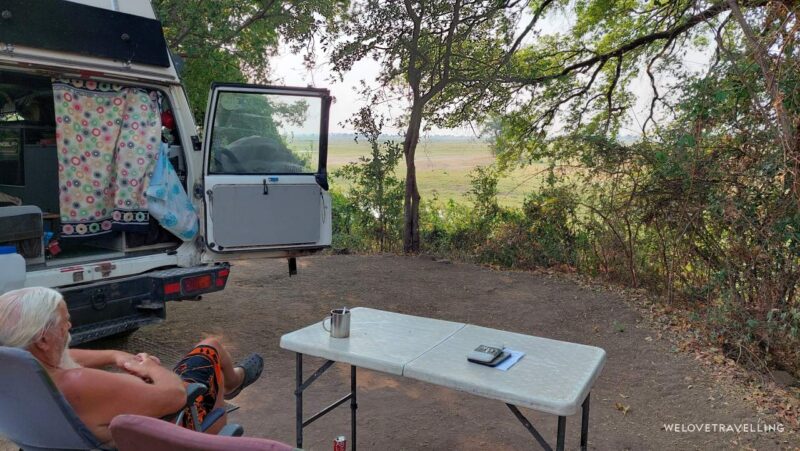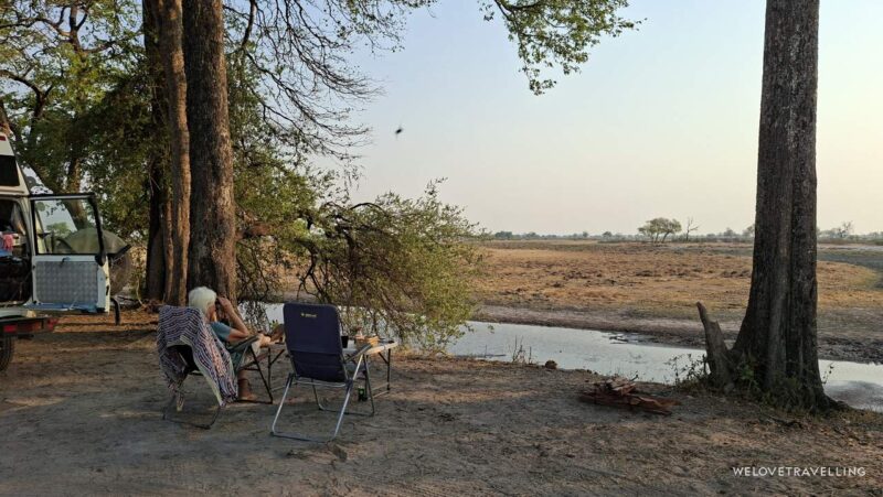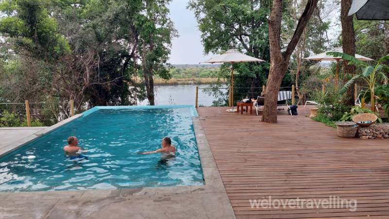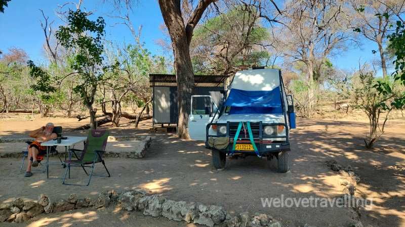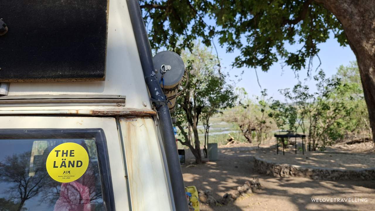 Über die Wellblechkiste zurück passieren wir Kachikau und Kavimba und entscheiden uns für die Muchenje Campsites. Es gibt Schatten und einen kleinen Pool zum abkühlen. Die Aussicht vom Camp ist sehr schön.