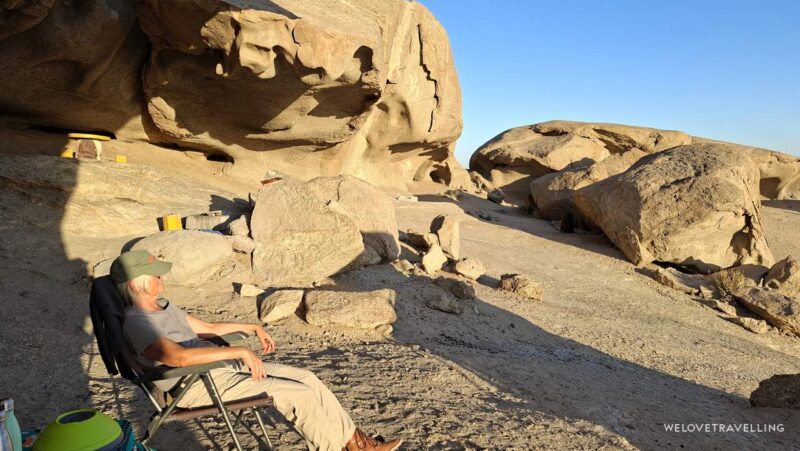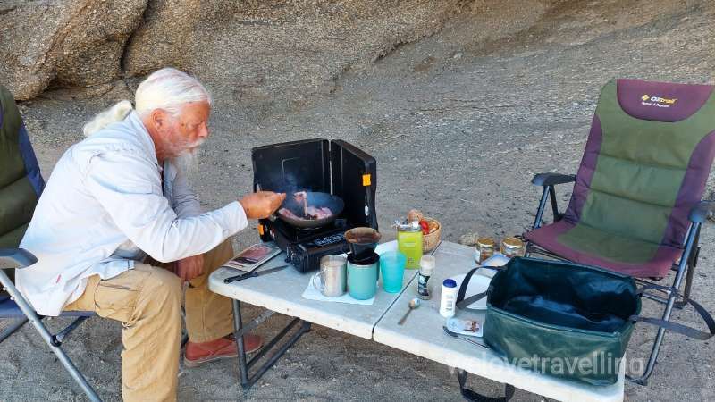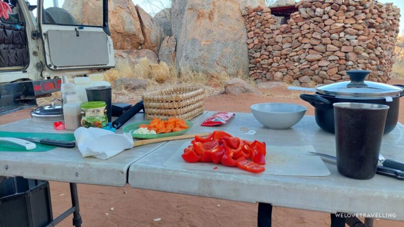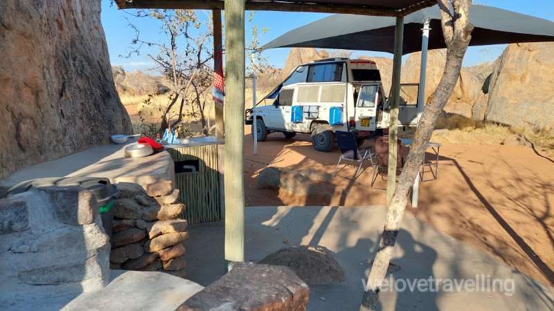 Schon lange wollten wir im Hoada Camp übernachten, hatten aber immer Pech und es war ausgebucht. Jetzt zu Franks Geburtstag haben wir Glück und mit Campsite 5 einen sehr schönen Platz. Ich schaue mir am Nachmittag den in die Felsen gebauten Pool- und Barbereich an. Unterm Sternenhimmel bei absoluter Ruhe genießen wir unser selbst gekochtes Gulasch.