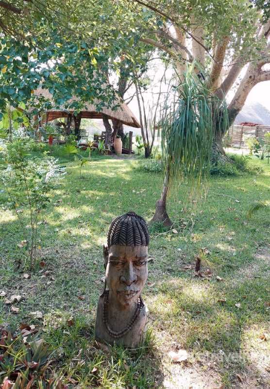 Big Five Lodge mit kunstvoll gestalteten Schnitzereien und Skulpturen