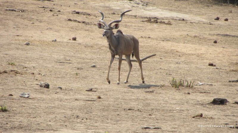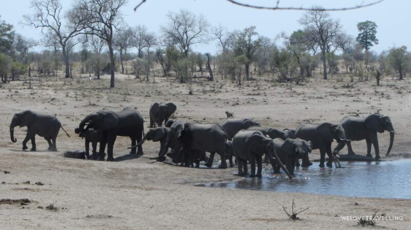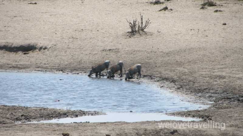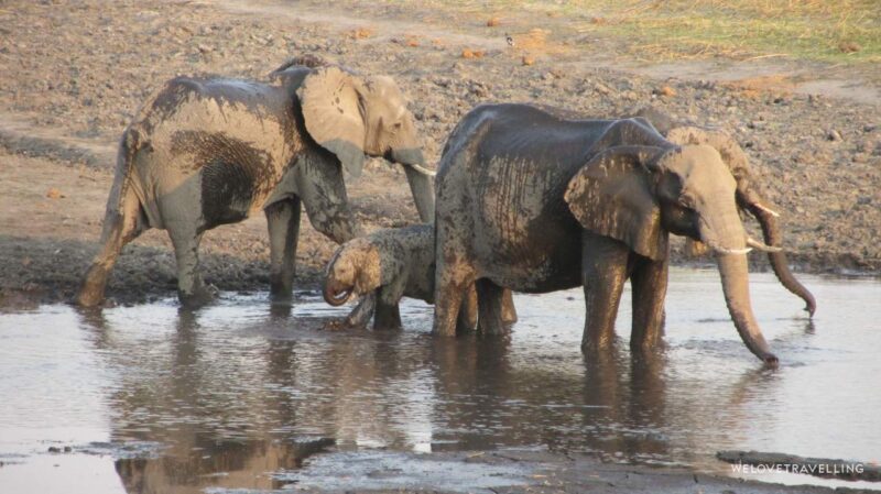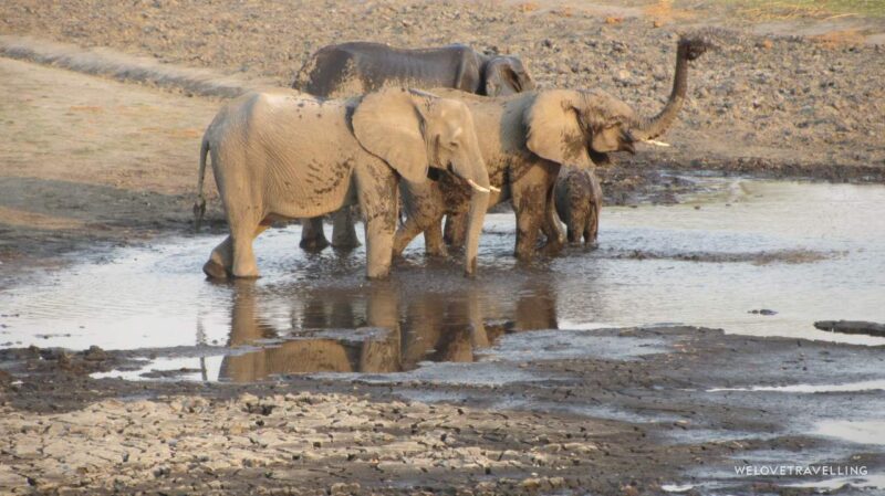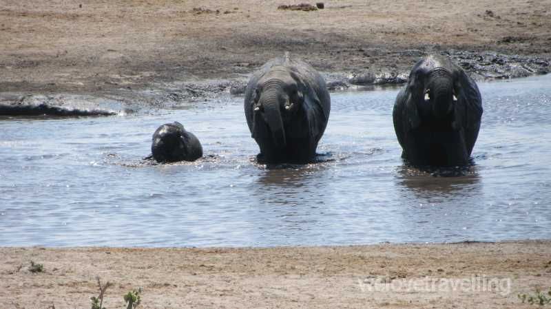 Es gab zum Glück 1,5 l Flaschen im Craft Center. An der Nakatwa 1 Campsite gab es noch etwas Wasser im Flussarm. Anziehungspunkt für viele Tiere,  insbesondere jedoch Elefanten. Fasziniert beobachteten wir sie. Insbesondere der Babyelefant war entzückend mit seinen Rüsselspielen.