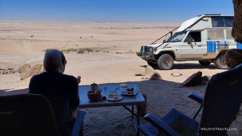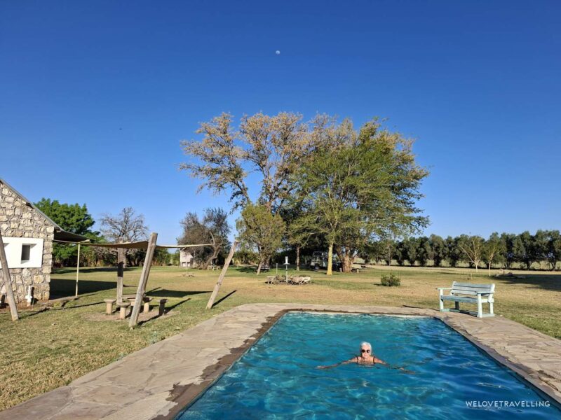 Auf der Farm Elisenheim bereiten wir unseren Toyo für die nächsten 5 Wochen vor. Ein kleineres Problem mit einem lockeren Kontakt am Verteilergetriebe lässt sich noch bei Stefan in der Werkstatt reparieren und wir können nun am Freitag beruhigt los fahren bis Grootfontein, wo wir am frühen Abend am Meteorite Camp ankommen. Es ist wunderbar, wir sind alleine auf dieser schönen Campsite und ich hüpfe in den Pool und genieße den Ausblick und Kaffee im kühlenden Nass.