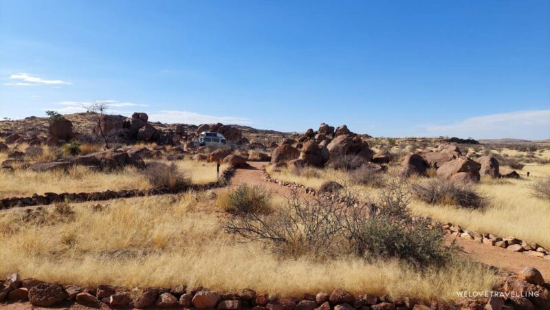 Die Wellblechpiste bis auf ein kurzes Stück bei Twyfelfontein ist ermüdend. In Uis gehen wir ins Brandberg Rest Camp. Trotz guter Bewertungen kein schönes Camp.