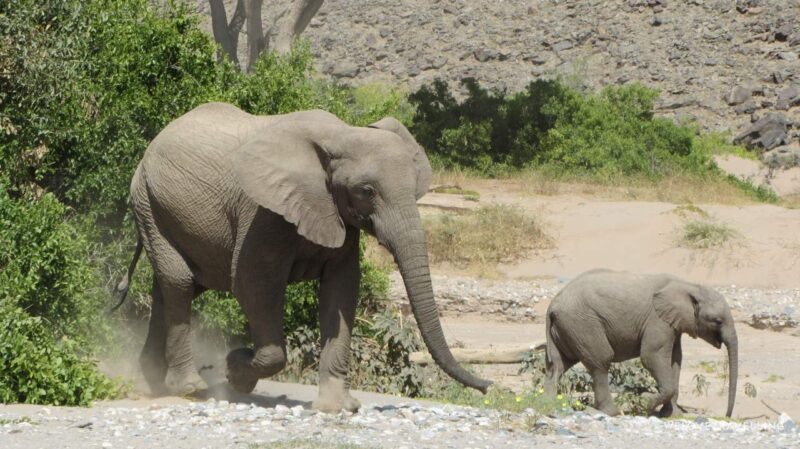 Im Hoanib Flussbett treffen wir auf die berühmten Wüstenelefanten.