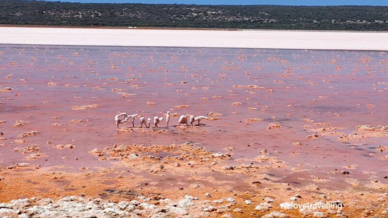 Das Pink des Sees kommt durch eine grüne Algenart zustande, die in Kombination mit hohem Salzgehalt, hoher Temperatur und starkem Lichteinfall Beta-Carotin produziert um sich gegen den starken Lichteinfall zu schützen. Diese Alge trägt den Namen Dunaliella salina. Hier an der Hutt Lagoon wird sie sogar gezüchtet und zwar vom weltweit größten Chemiekonzern BASF. Das von der Alge produzierte Beta-Carotin wird nämlich beispielsweise für Nahrungsergänzungsmittel und als Lebensmittelfarbe verwendet. Aus diesem Grund hat genau dieser wundervolle See einen riesigen Vorteil: Er ist garantiert immer farbig.