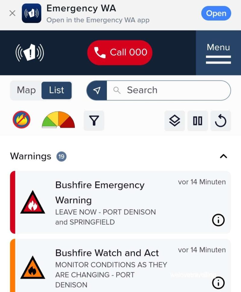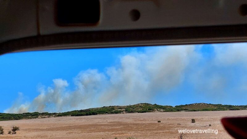 Planänderung! Wir fahren wieder auf den Highway und sehen die Feuer aus der Ferne. Die Straßen zum Strand sind bereits geschlossen. Um in möglichst sicherer Entfernung zu sein steuern wir nun Green Head an, ca. 150 km südlich, in der Dynamite Bay gelegen. Ein entspannter kleiner Ort.